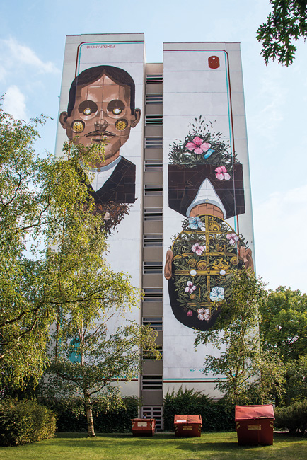 Als das sechste Wandbild in der Neheimer Straße in Tegel Süd enthüllt wurde, brach ein Sturm der Entrüstung los. Das 42 Meter hohe Bild des spanischen Künstlers Borondo zeigt ein Mädchen, das in einer Blutlache steht. Es schaut durch einen Spalt auf die andere Seite. Da blickt es in einen Wald, und an einem der Bäume ist ein fast nackter, von Pfeilen durchbohrter Mann gebunden. Deprimierend sei das Wandbild, so die Kommentare von Mietern und Bewohnern der umliegenden Häuser. Doch die Auftraggeberin für das Kunstwerk reagierte darauf nicht. Felix Schönebeck wandte sich an die Wohnungsbaugesellschaft Gewobag. Fehlanzeige. „Weil ich kein Mieter des Unternehmens bin, wollte die Gewobag nicht mit mir reden.“ So setzte er das Problem auf seine Internetseite und aktivierte seine Pressekontakte. Nun wurde das Wandbild quasi über Nacht bekannt und rückte die Kunst, die da an der Peripherie entstanden war, ins Zentrum medialer Aufmerksamkeit.