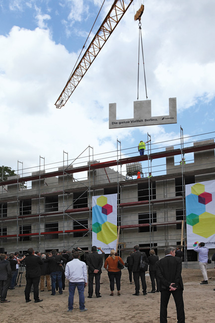 Sieben Monate Bauzeit – und fertig ist das ganze Haus: In Reinickendorf wächst die erste von einem landeseigenen Wohnungsbauunternehmen errichtete Gemeinschaftsunterkunft für Flüchtlinge. Bereits im Dezember können hier 230 Menschen einziehen, die bisher in Massenunterkünften leben müssen. Das neue Gebäude ist nicht nur kostengünstig und schnell errichtet, sondern mit seinem durchdachten Grundriss auch nachhaltig nutzbar. Unaufwendig können hier einmal preiswerte Wohnungen entstehen.