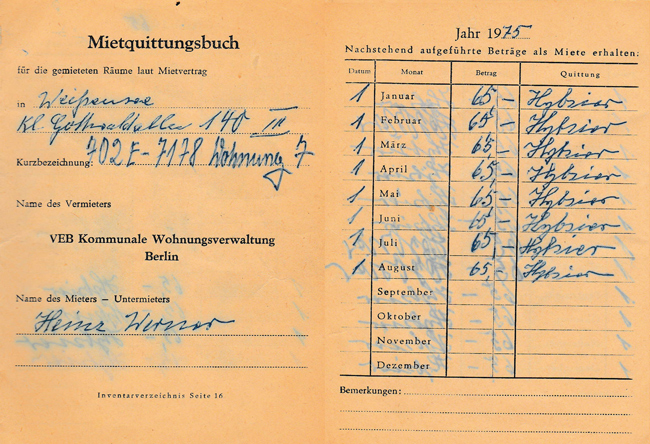 Als wir unsere erste Wohnung bekamen, erhielt ich mit dem Mietvertrag ein Mietzahlungsheft. Dort hinein wurde der monatliche Mietbetrag von einem(r) von der KWV beauftragten zuverlässigen Mieter(in), die fast immer auch eine Tätigkeit als Hauswart innehatten, eingetragen und damit quittiert. Das Geld wurde dann an einem von der KWV festgelegten Zahltag in der Kasse der KWV vom Beauftragten eingezahlt. Es war selbstverständlich, dass wir jeden Ersten des Monats vor der Wohnungstür des Mieteinnehmers standen und unsere Miete bezahlten. Unsere Miete betrug damals für eine Eineinhalbzimmerwohnung mit Außenklo, 3. Hinterhof, 4 Treppen, mit Ofenheizung ganze 34,20 Mark der DDR. So einfach ging das – auch ohne Girokonto.