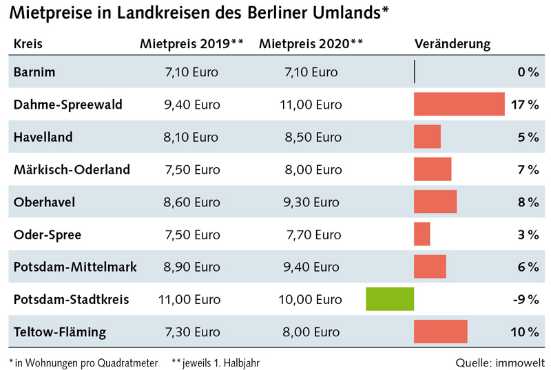 Das hohe Preisniveau Berlins spüren die Mieter im Umland: Dort werden nach Berlin die höchsten Angebotsmieten in Ostdeutschland verlangt – und das Niveau steigt weiter. Auf 8 Euro pro Quadratmeter kletterten zum Beispiel die Mieten im Landkreis Teltow-Fläming (+ 10 Prozent).