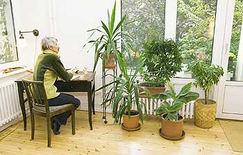 Grüne oder blühende Zimmerpflanzen sind eine wahre Bereicherung für das physische und psychische Wohlbefinden. Und sie können etwas, was künstliche Pflanzen, ob aus Seide, Stoff oder Plastik, nicht können: Sie verbessern das Raumklima. Pflanzen sind so etwas wie eine natürliche Klimaanlage. Sie verwandeln die verbrauchte in frische Luft. Menschen atmen Kohlendioxid aus, und je mehr davon in der Luft ist, desto schlapper und müder fühlen sie sich. Die Pflanzen nehmen Kohlendioxid auf und produzieren durch Photosynthese Sauerstoff. Das Kohlendioxid wird um so effektiver entsorgt, je mehr Blattoberfläche die Pflanze in der Gesamtheit ihrer Blätter hat. Große Blattoberflächen haben die Banane und Ficus-Arten.