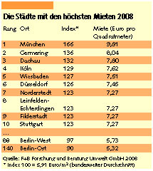 Die Differenzierung der durchschnittlichen Vergleichsmieten hat sich auch im vergangenen Jahr fortgesetzt. 7,21 Euro zahlten Münchner Mieter für den Quadratmeter Wohnfläche. Lagen die Mieten dort im Jahr 2006 noch 54 Prozent über dem bundesweiten Durchschnitt von 5,91 Euro pro Quadratmeter, waren es 2007 bereits 77 Prozent. Das strahlt auch auf das Umland aus: Auf die bayerische Metropole folgen im bundesweiten Ranking die Städte Germering und Dachau auf den Plätzen 2 und 3.