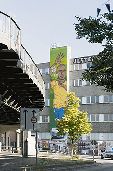 Brunner: Die Auseinandersetzung mit den Menschen, die unsere Bilder jeden Tag sehen würden, war uns wichtig. In der Neuköllner Richardstraße etwa setzten wir uns mit den Anwohnern zusammen. Die Familien böhmischer Abstammung sollten ihre Vorstellung äußern. Der Wunsch lautete: „Wat Schönet!“ Damit wurde eine längere Debatte eingeleitet, die am Ende zu einem Fassadenbild führte, dass die Geschichte der Einwanderer aus dem 18. Jahrhundert darstellt, aber auch die Gegenwart ihrer heute dort lebenden Nachfahren: Auf einer breiten Theaterbühne sieht man den Zug der Einwanderer nach einem Denkmalrelief, und auch einige der Nachbarn, die über den Entwurf mitdebattiert hatten, portraitierten wir in diesem Bild ebenfalls.