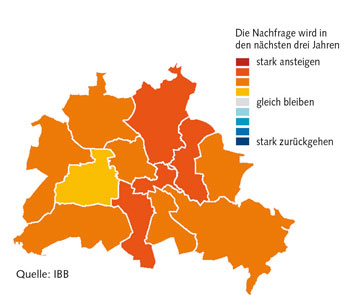Insgesamt rechnen die Experten in allen Marktsegmenten und den meisten Bezirken mit einer steigenden Nachfrage, mit steigenden Preisen, einer Verknappung des Angebots und einem Rückgang der Leerstände. Auch eine zunehmende Segregation – der Rückzug einkommensschwacher Haushalte aus den zentralen Lagen Berlins an den Stadtrand – ist eine mehrheitlich geäußerte Einschätzung der von der IBB befragten Wohnungsmarktbeobachter.