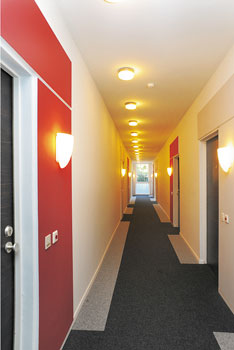 Licht und Farbe an der richtigen Stelle erleichtern die Orientierung: Flur eines Tempelhofer Gewobag-Projekthauses