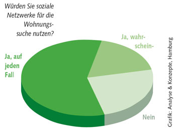 Erstmals hat die Hamburger Beratungsgesellschaft Analyse & Konzepte im Rahmen ihres jährlichen „Servicemonitor Wohnen“ neben der Zufriedenheit der Mieter mit den Leistungen ihrer Vermieter auch die Aktivitäten von Mietern in sozialen Netzwerken erfasst. Als Instrument der Wohnungssuche haben sich soziale Netzwerke allerdings noch nicht etabliert.