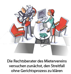 Wer gegen seinen Vermieter klagen will beziehungsweise sich gegen dessen Klage zur Wehr setzen muss, kann sich – nach vorheriger Beratung durch den BMV – an einen Anwalt seiner Wahl wenden. „Wir empfehlen aber, einen unserer Vertragsanwälte zu nehmen, denn die sind mietrechtlich versiert und kennen außerdem das Procedere mit der Rechtsschutzversicherung„, erklärt Isabell Pohl. Der Anwalt oder die Anwältin schickt dann vor Beginn der gerichtlichen Auseinandersetzung die Klageschrift sowie die Klageerwiderung an den Berliner Mieterverein, verbunden mit dem Antrag, für diesen Rechtsstreit Kostendeckung zu erteilen.
