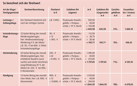 Gerichte orientieren sich dagegen an objektiven Kriterien, etwa den reinen Bauzeiten, und daran, welche Räume betroffen sind. Mehr als 20 Prozent Minderung werden selten zuerkannt. Um keine Kündigung des Vermieters zu riskieren, empfiehlt es sich oft, die Miete unter Vorbehalt zu zahlen und den Minderungsbetrag einzuklagen. Die Minderungshöhe mittels Feststellungsklage zu klären, scheitert meist daran, dass die Rechtsschutzversicherung nicht die Kosten deckt.