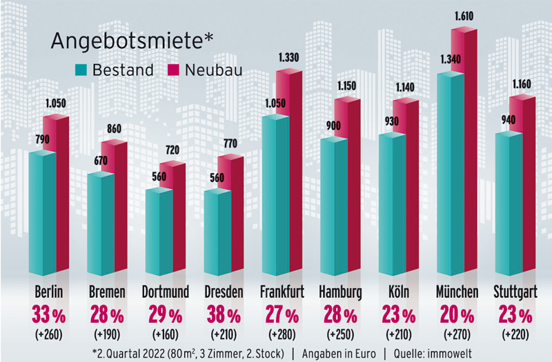 Auch in anderen Metropolen müssen Wohnungssuchende mit deutlichen Mehrkosten rechnen. So ist die monatliche Miete einer neuen Wohnung in Hamburg um 250 Euro höher als bei einer Bestandswohnung. In Berlin beträgt der Unterschied sogar 260 Euro. Zu beachten ist aber, dass Mieterinnen und Mieter von Neubauwohnungen wegen eines besseren energetischen Zustandes weniger heizen müssen, was angesichts der rasant steigenden Energiepreise einen großen finanziellen Vorteil bedeuten kann.