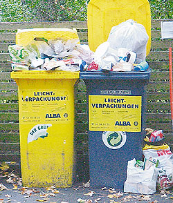 So schön, wie Ihr Foto die gelbe Tonne auf Seite 20 Ihres Beitrags zeigt, sieht sie bei uns im Müllhof in der Gagfah-Siedlung höchstens bis Mitte der Woche aus. Ab Mittwoch/Donnerstag sieht sie so überfüllt aus wie auf dem beigefügten Foto, am Wochenende noch schlimmer. Montags werden die gelben Tonnen geleert. Die regelmäßig vollen grauen Tonnen werden zwei Mal in der Woche geleert. Berufstätige, die sich erst am Wochenende mit Hausarbeit befassen können, müssen dann ihren Verpackungsmüll in die grauen Tonnen werfen, was nicht im Sinne des Erfinders ist.