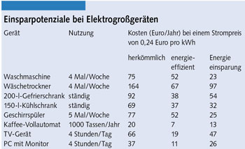 Weitere Einsparungen erfordern, alte stromfressende Elektrogeräte zu entsorgen und gegen neue, energiesparende auszutauschen. Ein moderner Kühlschrank der besten Effizienzklasse verbraucht nur noch etwa ein Fünftel der Energie eines zehn Jahre alten Gerätes, nach etwa zehn Jahren haben sich die Kosten eines neuen Geräts durch die Energieeinsparung amortisiert. Allein mit einem neuen Wäschetrockner lassen sich 97 Euro Stromkosten pro Jahr sparen.