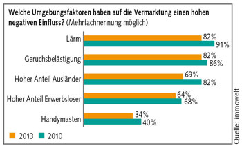 Zu den unbeliebten Wohnlagen der Deutschen gehören nach wie vor laute und übelriechende Straßenzüge: 82 Prozent der Makler identifizieren Lärm (2010: 91 Prozent) und starke Geruchsbelastung (2010: 86 Prozent) als häufigste Hemmschuhe für den Vermarktungserfolg. Ebenfalls gemieden werden ihrer Einschätzung nach Wohngegenden mit einem hohen Anteil an Erwerbslosen (64 Prozent, 2010: 68 Prozent).
