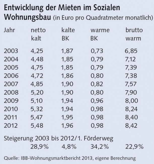 Die Ursache für die absurde Situation des Berliner Sozialen Wohnungsbaus liegt im früheren Fördersystem. Die öffentliche Hand zahlt heute noch für die absichtlich aufgeblähten Baukosten der 70er bis 90er Jahre. Die Kostenmieten erreichen nicht selten schwindelerregende Höhen von 13 Euro pro Quadratmeter, in einzelnen Fällen sogar 21 Euro. Der Berliner Landeshaushalt zahlt den Eigentümern die Differenz zwischen der Kostenmiete und den von den Bewohnern gezahlten Mieten. Der Senat fährt die Förderung Jahr für Jahr um 13 Cent pro Quadratmeter zurück. Um diesen Betrag erhöhen die Vermieter der Sozialwohnungen alljährlich die Miete.