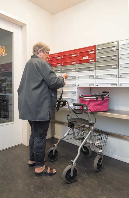 Mit dem achtgeschossigen Seniorenwohnhaus Westphalweg 7 in Mariendorf beteiligte sich das Wohnungsunternehmen Gewobag am Bundesmodellvorhaben „Altersgerecht umbauen“. Einzelne Bereiche wurden beispielhaft neu gestaltet – nach den Grundsätzen des Universal Designs. Des Weiteren wurde ein neuer Gemeinschaftsraum eingerichtet und der Flur sowie das Foyer im Erdgeschoss umgebaut. Das Bad wurde mit einem unterfahrbaren Waschbecken, Klappstützgriffen neben dem WC und einem Alarmzugschalter ausgestattet. Eine neue Einbauküche und flexible Möbel im Wohnzimmer erhöhen den Wohnkomfort. Die farbliche Zonierung der unterfahrbaren Briefkastenanlage im Eingangsbereich erleichtert die Orientierung. Auch die Bodenbeläge haben aus diesem Grund unterschiedliche Farben. Das ist ästhetisch ansprechender Komfort für alle.