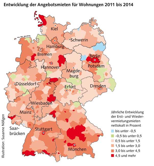 Die Bruttokaltmiete belief sich 2014 im Bundesdurchschnitt auf 7,10 Euro je Quadratmeter und Monat. Dabei gab es eine Spannweite von durchschnittlich 4,08 Euro pro Quadratmeter im Landkreis Wunsiedel bis zu 13,99 Euro in München. Die höchsten Mieten mussten in den Großstadtkernen (8,79 Euro) und vielen Hochschulstandorten (8,49 Euro) gezahlt werden. Städtische Umlandkreise lagen bei knapp 6,70 Euro. Die Mieten in ländlichen Kreisen waren mit etwa 5,50 Euro vergleichsweise günstig. Zwischen 2011 und 2014 sind die Bestandsmieten jährlich um etwa 1,3 Prozent gestiegen. Dagegen stiegen die Erst- und Wiedervermietungsmieten um 3,4 Prozent. In den Groß- und Universitätsstädten erhöhten sich diese Mieten jährlich um knapp 5 Prozent.