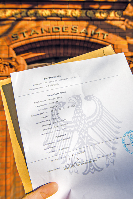 Vieles ist nach einem Todesfall zu erledigen: etwa eine Rente abzumelden, einen Erbschein zu beantragen, Bankkonten und Versicherungen aufzulösen – oder eine Mietwohnung zu kündigen. Denn das Mietverhältnis endet nicht automatisch mit dem Tod des Mieters, sondern geht auf seine Erben über. Wer da so schnell wie möglich aus dem Vertrag heraus möchte, muss nachweisen, dass der Vater, die Mutter oder der Partner gestorben ist, und dafür eine Sterbeurkunde vorlegen. Erst ab diesem Zeitpunkt gilt die dreimonatige Kündigungsfrist. „Ohne das Dokument sind hinterbliebenen Angehörigen im Grunde die Hände gebunden“, sagt Fabian Lenzen, Sprecher der Bestatterinnung Berlin-Brandenburg.