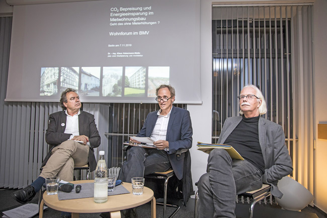 Reiner Wild, BMV-Geschäftsführer und Dritter auf dem Podium, führte aus, dass die gesamtgesellschaftliche Aufgabe Klimaschutz heute zu einem Großteil von Mietern getragen wird: „Der Vermieter kann sich seine Investitionen vom Mieter bezahlen lassen.“ Mit der beschlossenen CO2-Bepreisung werde die Belastung noch steigen, gleichzeitig sei es kein wirksames Lenkungsinstrument für energieeffiziente Maßnahmen, weil die Mieter schließlich in jedem Fall die Heizkosten tragen müssen.