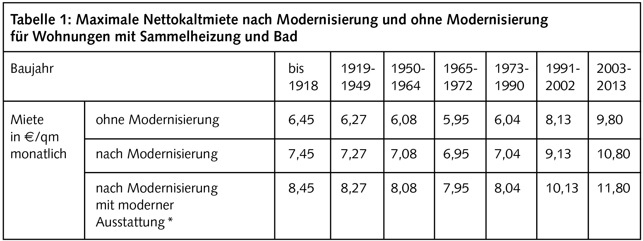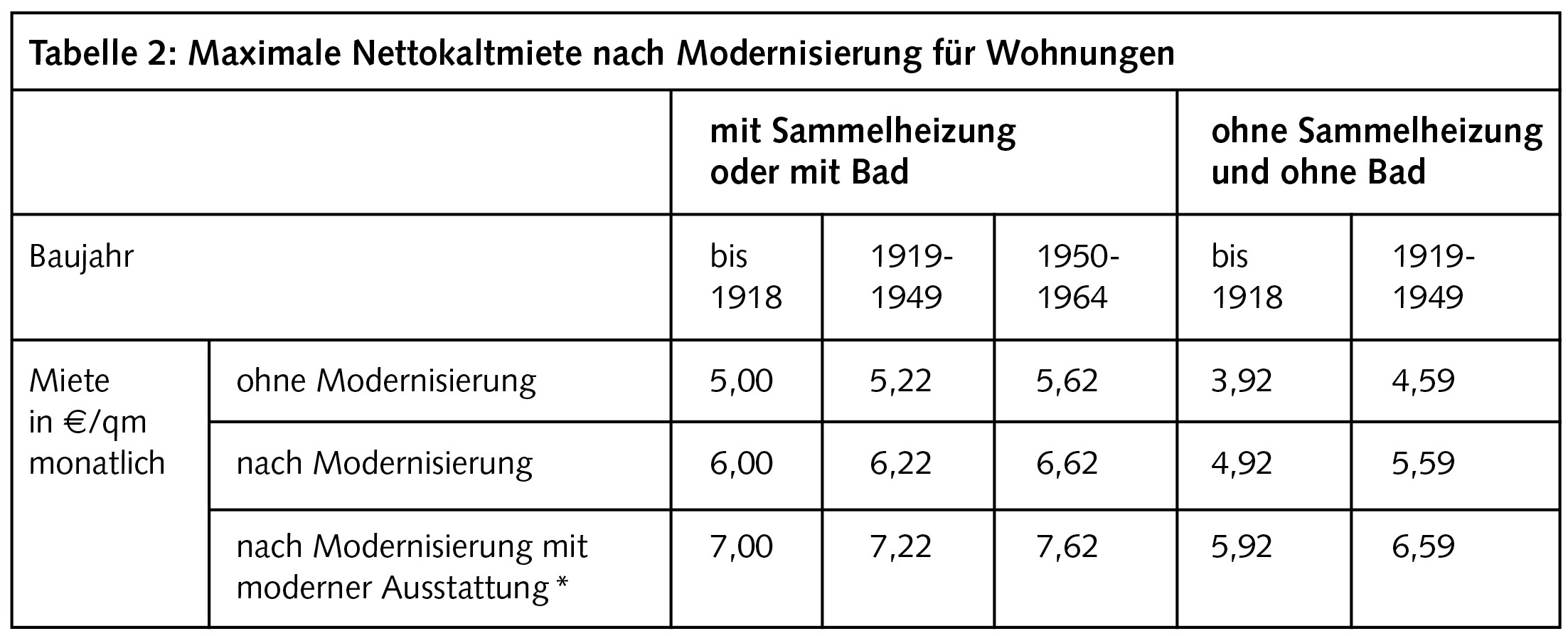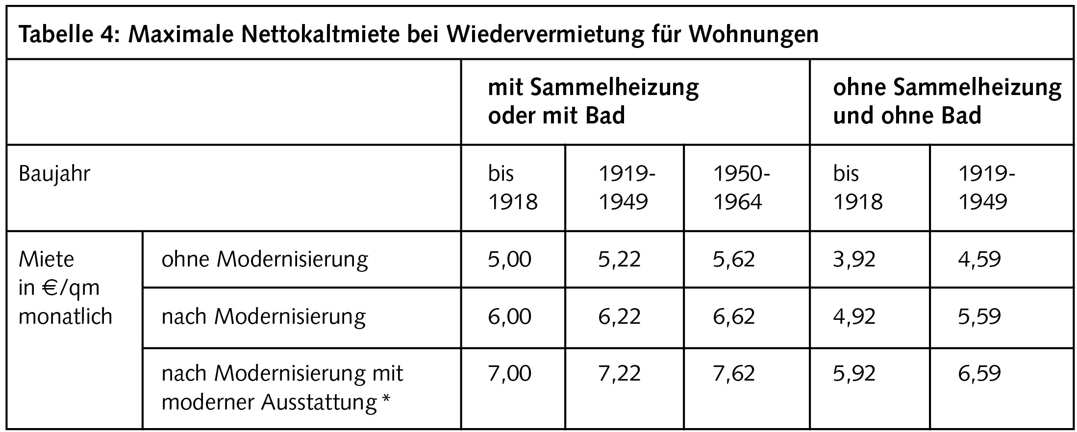 Für Wiedervermietung nach dem Inkrafttreten des Gesetzes gilt: Wurde der leere Wohnraum zwischen dem Stichtag und dem Vertragsabschluss unter den oben genannten Bedingungen modernisiert, können die Mietobergrenzen aus der Tabelle (siehe unten) um bis zu 1,- Euro pro Quadratmeter monatlich überschritten werden. Bei moderner Ausstattung (siehe Kasten unten) kann die Miete zusätzlich um 1,- Euro pro Quadratmeter den Ausgangstabellenwert überschreiten. Diese Erhöhungsmöglichkeit besteht auch dann, wenn nach Wiedervermietung modernisiert wird. In diesen Fällen gelten bei Wiedervermietung und Modernisierung die im Folgenden genannten Mietobergrenzen: