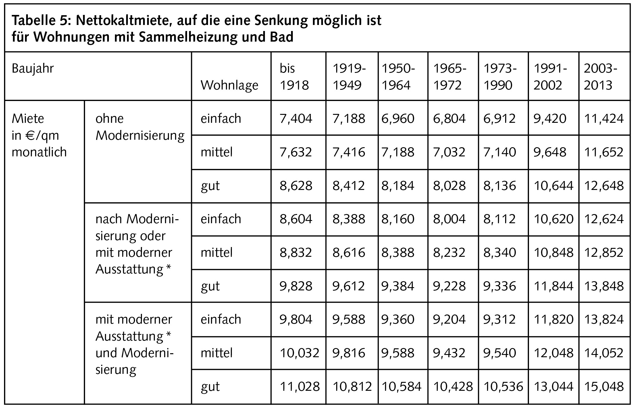Die in den Tabellen 5 und 6 dargestellten Mietwerte berücksichtigen bei einfacher Wohnlage einen Abzug von 0,28 Euro, bei mittlerer Wohnlage einen Abzug von 0,09 Euro und bei guter Wohnlage einen Aufschlag von 0,74 Euro pro Quadratmeter monatlich sowie einen Aufschlag von 20 Prozent. Für Mieten unterhalb der in den Tabellen 5 und 6 dargestellten Nettokaltmieten ist die Absenkung ausgeschlossen.